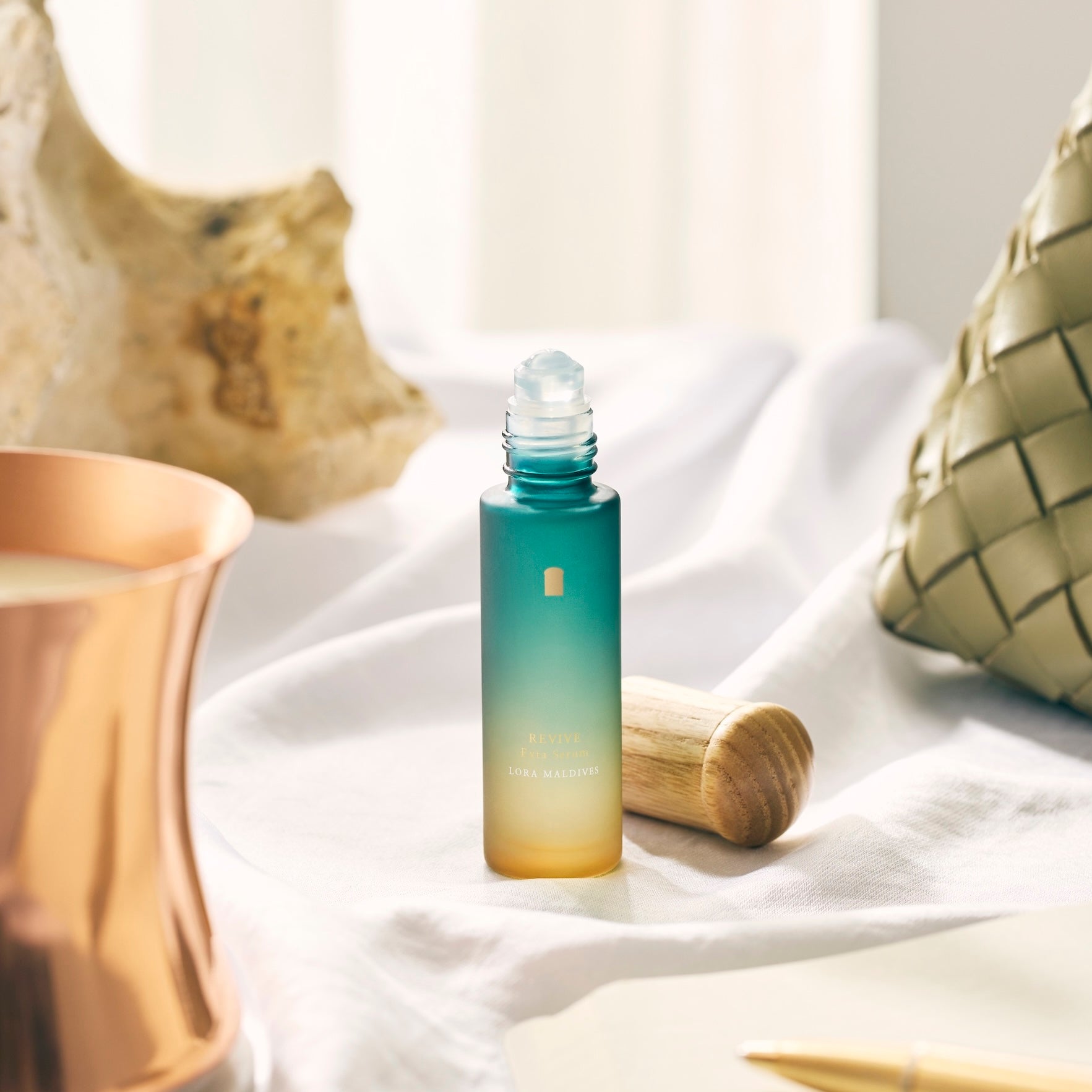 The cooling serum provides an instant recharge. The Maldives-inspired signature aroma lights up your spirit. The signature woodcap doubles as your personal massager.